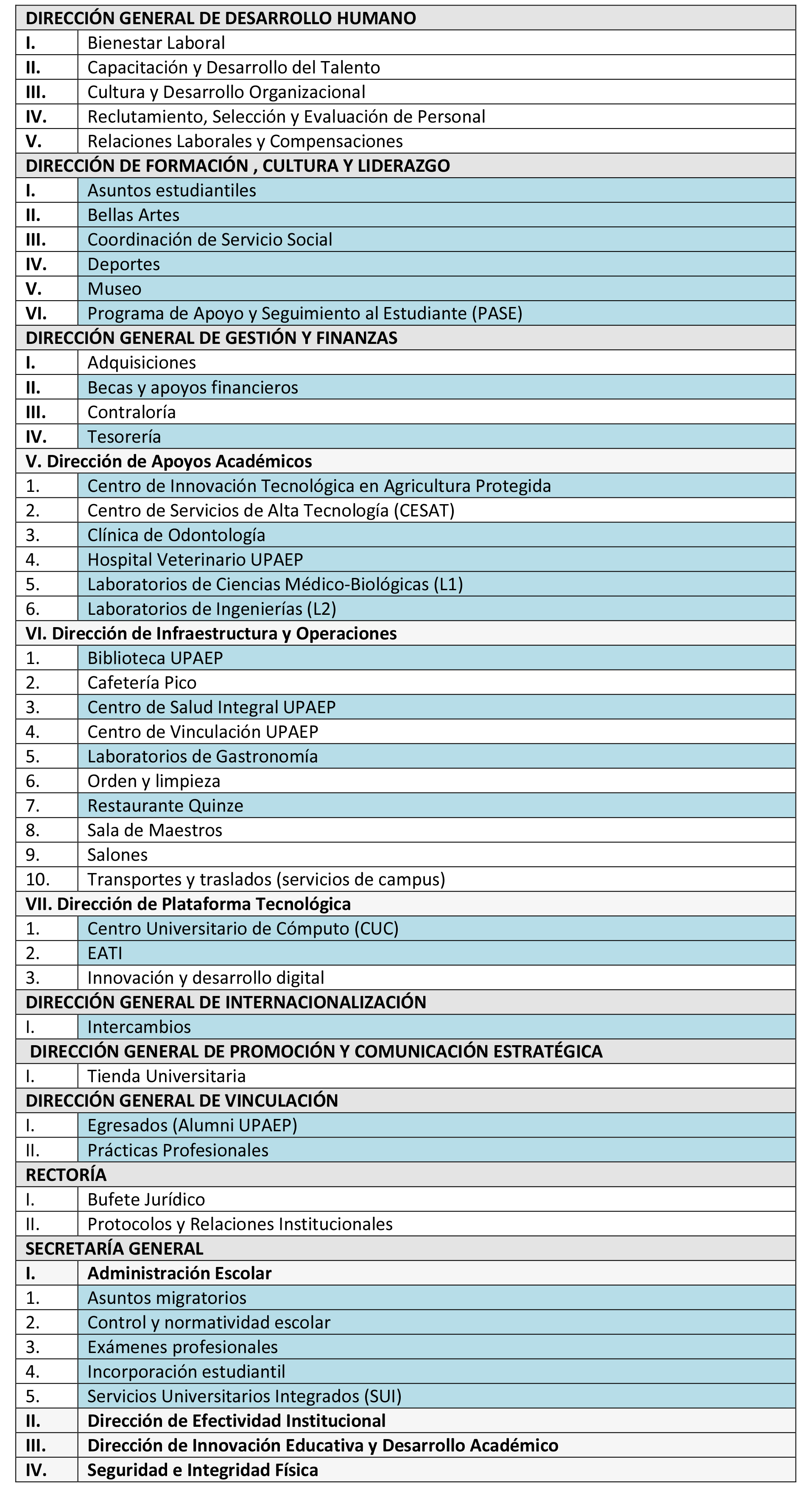 A continuación, se enlistan todas las áreas de servicio de UPAEP, señalando en color azul aquéllas que son áreas de servicio al estudiante.