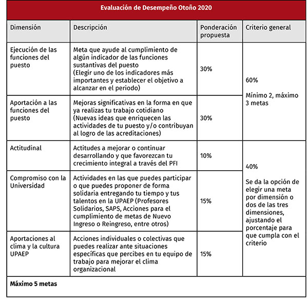 Con la intención de hacer mejoras que impacten en el cumplimiento de los objetivos de nuestra Universidad, definimos metas de desempeño cada periodo. La Evaluación de Desempeño nos anima a vivir la mejora continua como un proceso que genera efectos positivos (individuales y colectivos) y es reflejo de la Cultura de transformación que ha caracterizado desde sus inicios a la UPAEP.